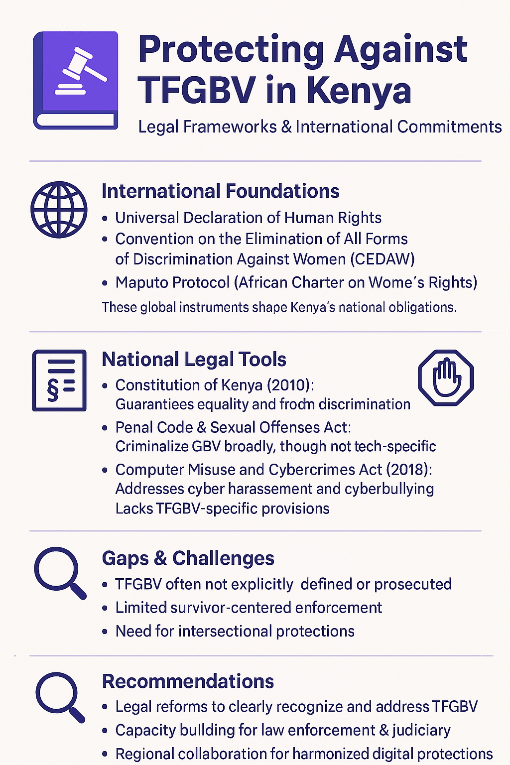 An infographic outlining how Kenya’s domestic laws—shaped by international agreements like CEDAW and the Maputo Protocol—address tech-facilitated gender-based violence (TFGBV). It highlights existing protections under the Constitution, Penal Code, and Cybercrimes Act, identifies key legal and enforcement gaps, and recommends reforms to build survivor-centered, inclusive digital justice.